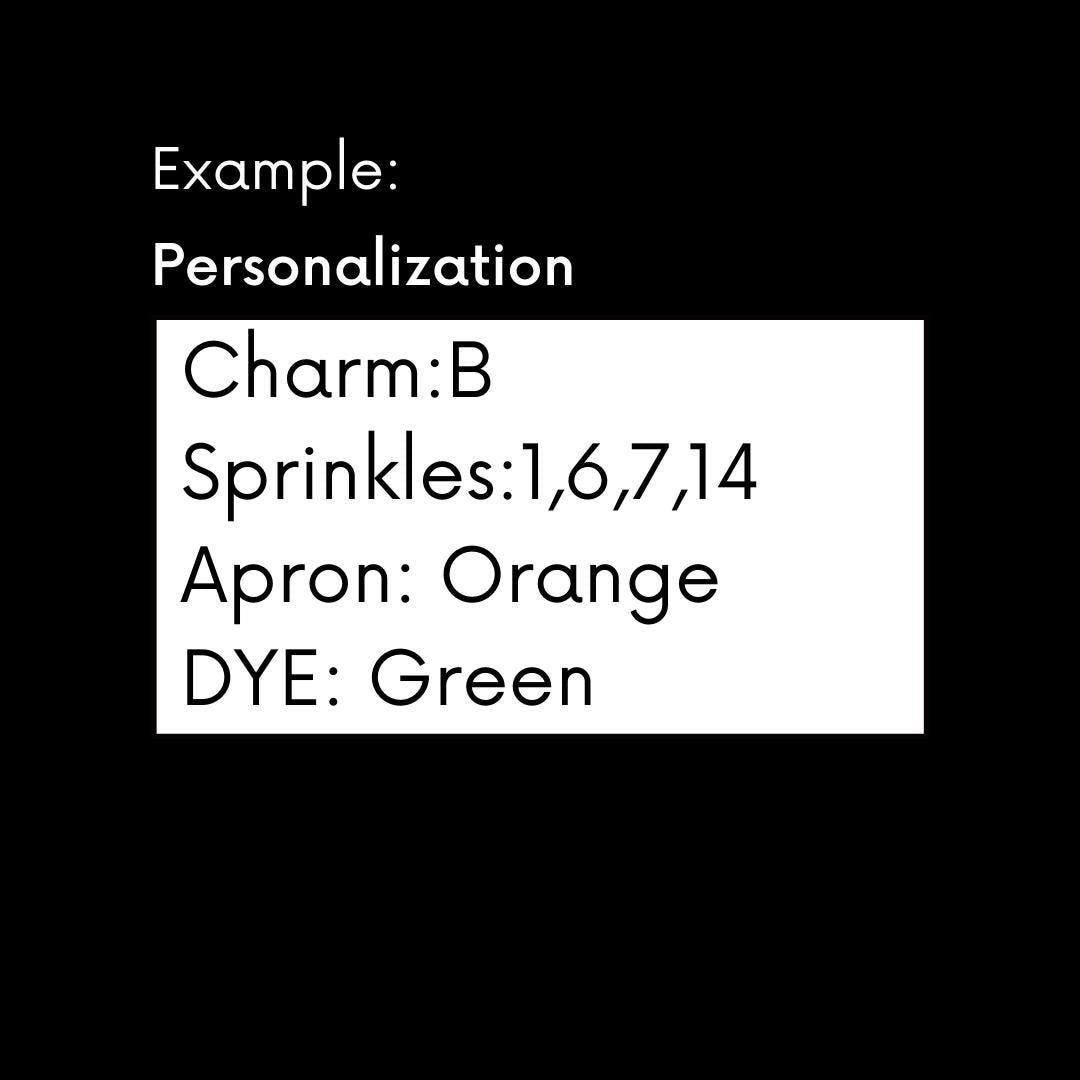 Write your choices in the personalization box: (charm, sprinkles, apron and dye)