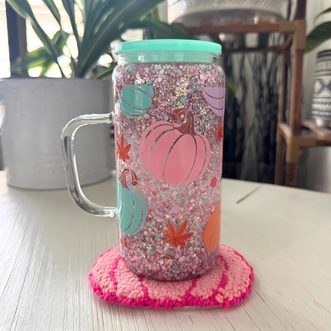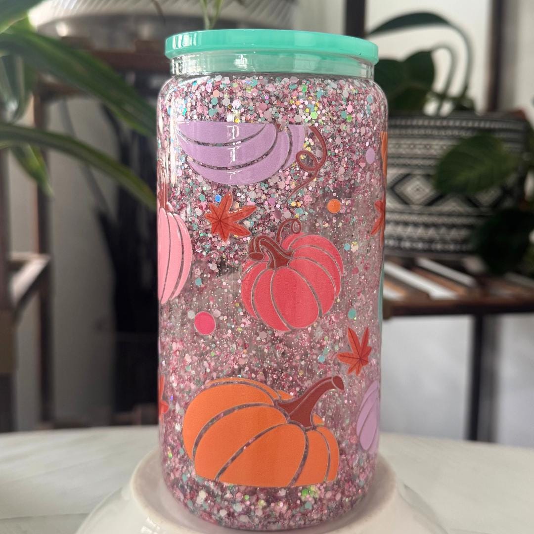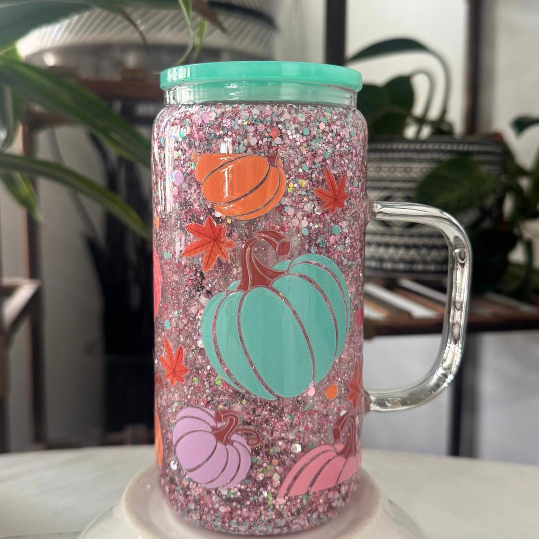 Sip in style with this Pink Pumpkin Snow Globe Tumbler, a glitter-filled glass cup with handle that sparkles with every shake. Perfect for fall drinks, iced coffee, or as a unique autumn gift, this collectible tumbler brings seasonal charm and everyday function together.